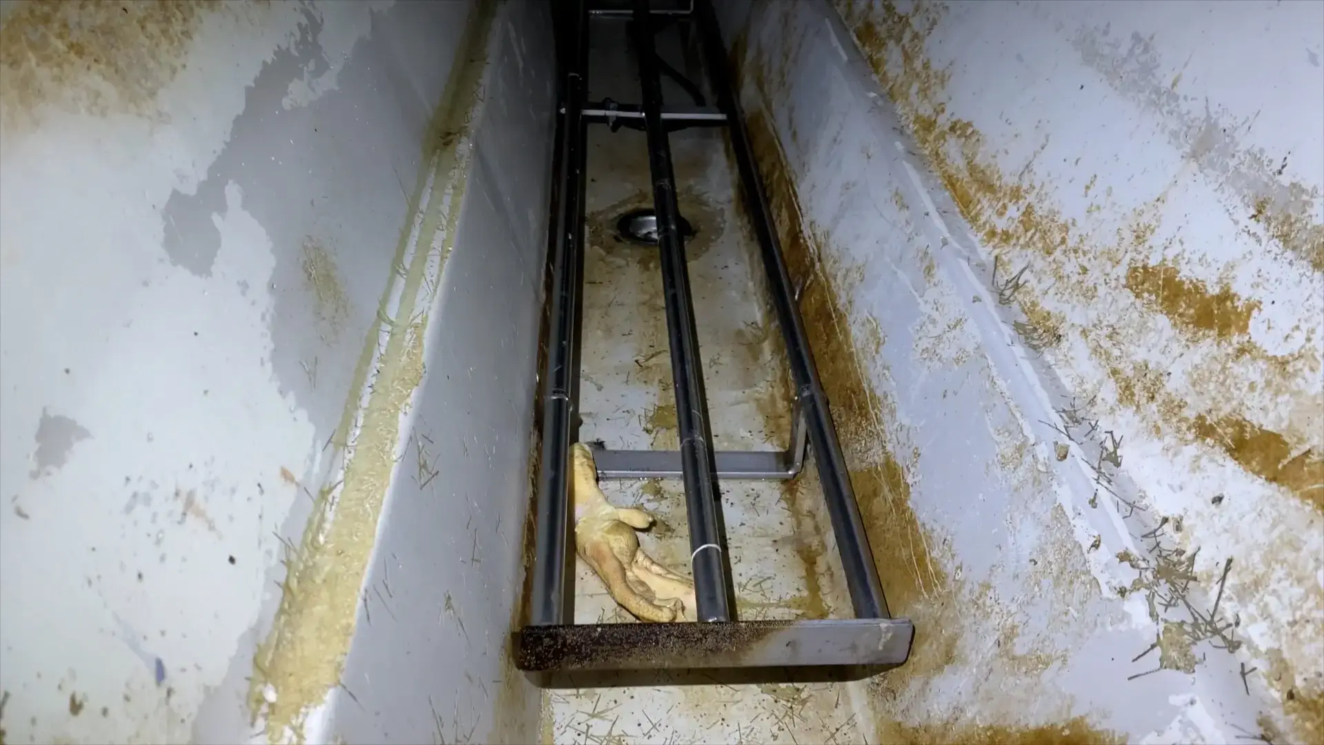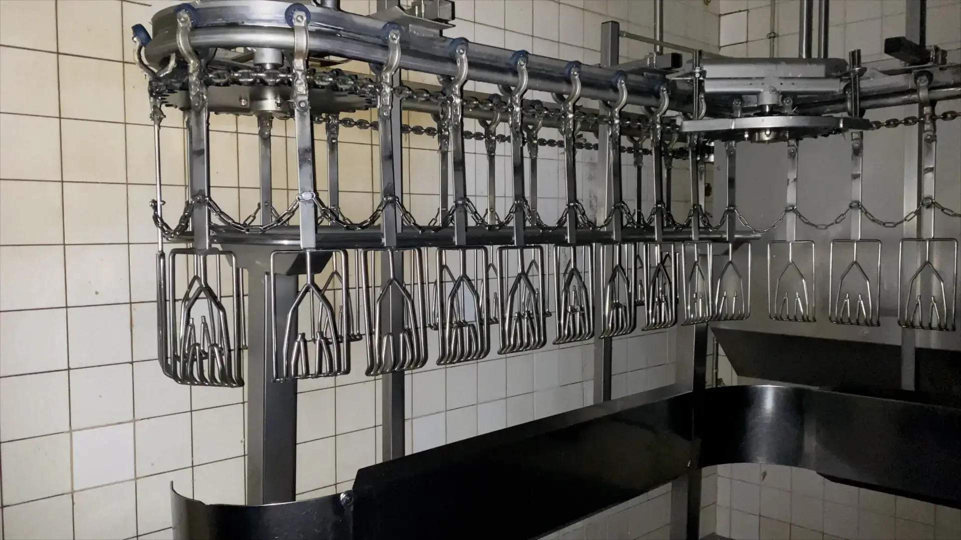Mehrfach stillstehende Förderbänder lassen Gänse minutenlang kopfüber hängen. Diese Situation verursacht massives, vermeidbares Leiden. Auf dem Förderband bleiben die Tiere immer wieder an einem Vorhang hängen. Beim anschließenden Kehlschnitt bluten die Tiere langsam aus.