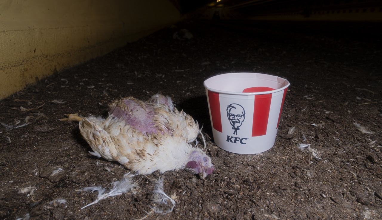 Die Fast-Food-Kette KFC ist für viele Menschen ein “guilty pleasure”: schnell, unkompliziert, lecker. Der Konzern pflegt dieses Image und stellt in seiner Werbung den unverwechselbaren Geschmack der Panade in den Vordergrund. Was in der Werbung jedoch niemals gezeigt wird, sind die Zustände, unter denen die Tiere leiden müssen, bevor sie auf dem Teller – bzw. im KFC-Eimer – landen. Hinter der knusprigen Panade steckt ein System aus systematischer Tierquälerei, Massentierhaltung und einem erbarmungslosen Geschäft mit dem Leben fühlender Lebewesen.